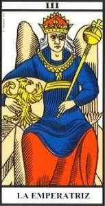 La Emperatriz también puede representar abundante abundancia de todo tipo. Ofrece una gran variedad de delicias, especialmente las de los sentidos: comida, placer y belleza. Ella puede sugerir una recompensa material, pero solo con el entendimiento de que las riquezas van con un espíritu generoso y abierto. La Emperatriz pide que se acepte el principio de la vida y se disfrute de su abundante bondad.